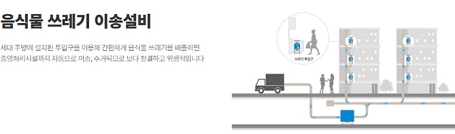 : 세대 주방에 투입구로 음식물 쓰레기를 배출하면 중앙 처리 시설까지 자동으로 음식물 쓰레기가 이송, 수거됨
