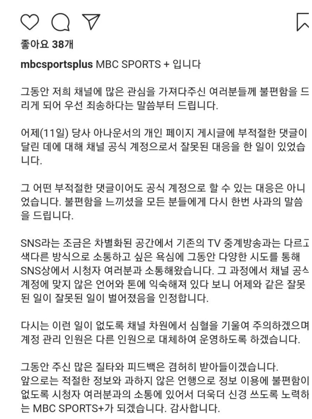 MBC 스포츠플러스 사과문 전문은 아래와 같았습니다.